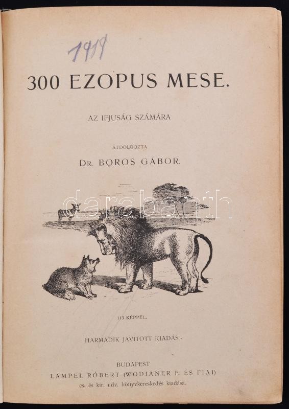 300 Ezopus-mese. Az ifjuság számára átdolgozta Boros Gábor. Harmadik kiadás. 113 képpel Bp., é.n. Lampel R. Kiadói illusztrált, kopottas egészvászon-kötésben. Néhány lapszél szakadozott. Ritka kötet!