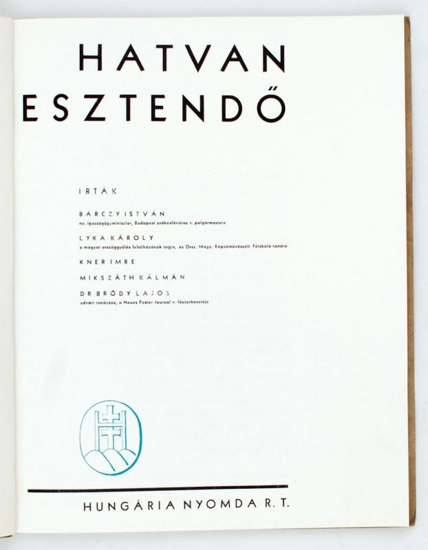 Bárczy István, Lyka et al.: Hatvan esztendő 1873-1933. Bp., 1933, Hungária Nyomda Rt. A nyomda jubileumára készült kiadvány érdekes írásokkal. Kicsit gyűrött papírkötésben,e egyébként jó állapotban.