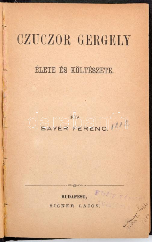 Leírás: Bayer Ferenc: Czuczor Gergely élete és költészete. Bp., 1879, Aigner Lajos k. 72 p. Korabeli kissé kopott félvászonkötésben. Ceruzás bejegyzésekkel.