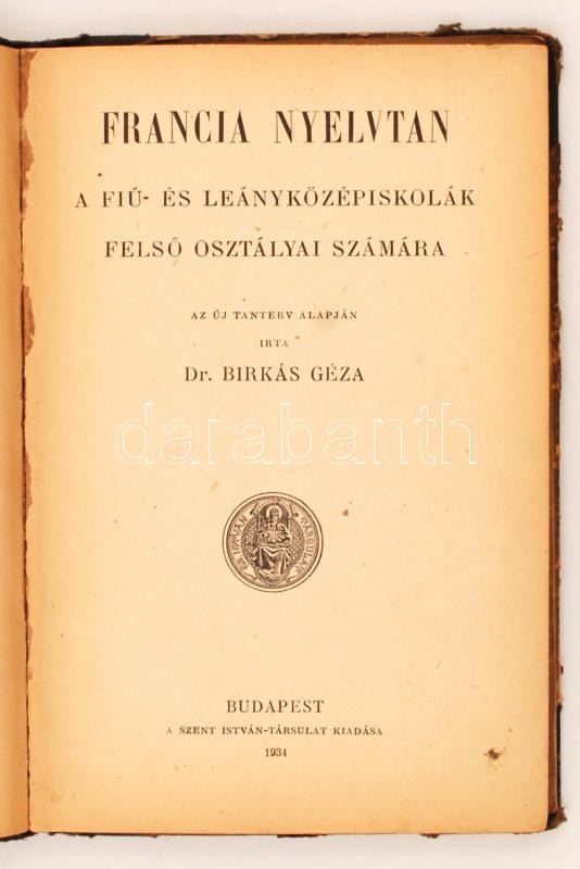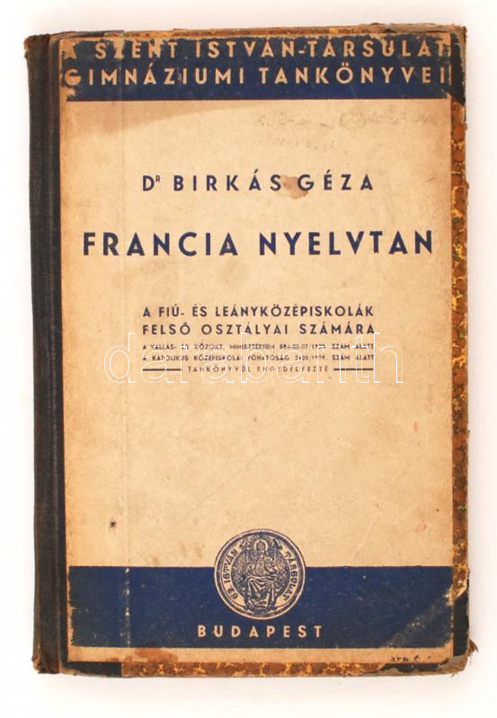Dr. Birkás Géza: Francia nyelvtan a fiú- és leányközépiskolák felső osztályai számára. Bp., 1934, Szent István Társulat. Félvászon kötés, viseltes állapotban.