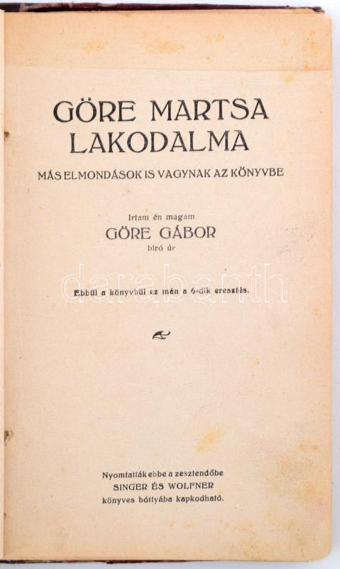 Leírás: Göre Gábor (Gárdonyi Géza): Göre Martsa lakodalma. Bp., 1920, Singer és Wolfner. Korabeli félvászonkötésben, a címlap felső része hiányzik.