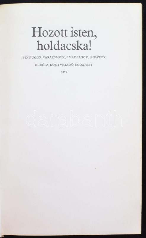 Leírás: Hozott isten, holdacska! Finnugor varázsigék, imádságok, siratók. Szerkesztette Bereczki Gábor. Bp., 1979, Európa. Kiadói egészvászon-kötésben.