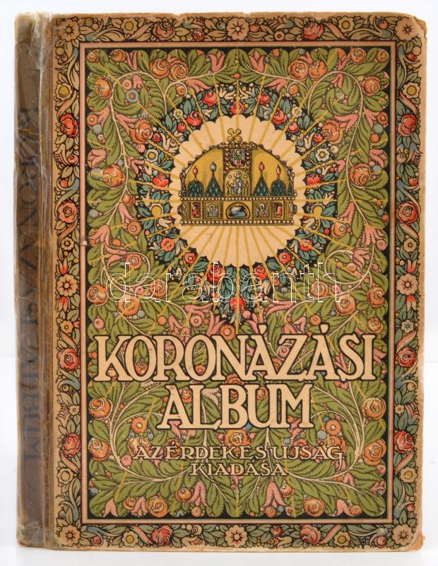 Koronázási album. Ábrányi Emil, Ambrus Zoltán, Gróf Andrássy Gyula, Gróf Apponyi Albert, Beöthy Zsolt, Berzeviczy Albert, Heltai Jenő, Herczeg Ferenc, Kabos Ede, Gróf Khun-Héderváry Károly, Kiss József, Krúdy Gyula, Molnár Ferenc, Móricz Zsigmond, Rákosi Viktor, Szomaházy István, Báró Wlassics Gyula eredeti közleményeivel. Bató József, Bér Dezső, Csont Ferenc, Dudits Andor, Endrey Sándor, Gedő Lipót, Herman Lipót, Honti Nándor, Komáromi-Kacz Emőke, Pólya Tibor, Pór Bertalan, Rippl-Rónai József, Rudnay Gyula, Végh Gusztáv, Vészi Margit, Zádor István eredeti rajzaival és festményeivel. Bp., 1917, Az Érdekes Újság kiadása. Kiadói, Végh Gusztáv tervezte, Félvászon kötésben, gazdag szövegközti és egész oldalas képanyaggal, gerince celluxszal javított, néhány lapon szakadással, kopott állapotban.