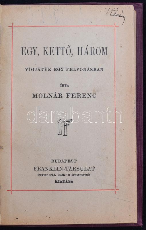 Molnár Ferenc: Egy, kettő, három (Vígjáték egy felvonásban) Bp., 1929... https://www.darabanth.com/hu/255-Gyorsarveres/255.0/Festmeny-mutargy-papirregiseg-egyeb/Konyvek-Egyeb-ritkasagok~600042/Molnar-Ferenc-Egy-ketto-harom-Vigjatek-egy-felvonasban-Bp-1929-Franklin-116-p-Kora~II1240816