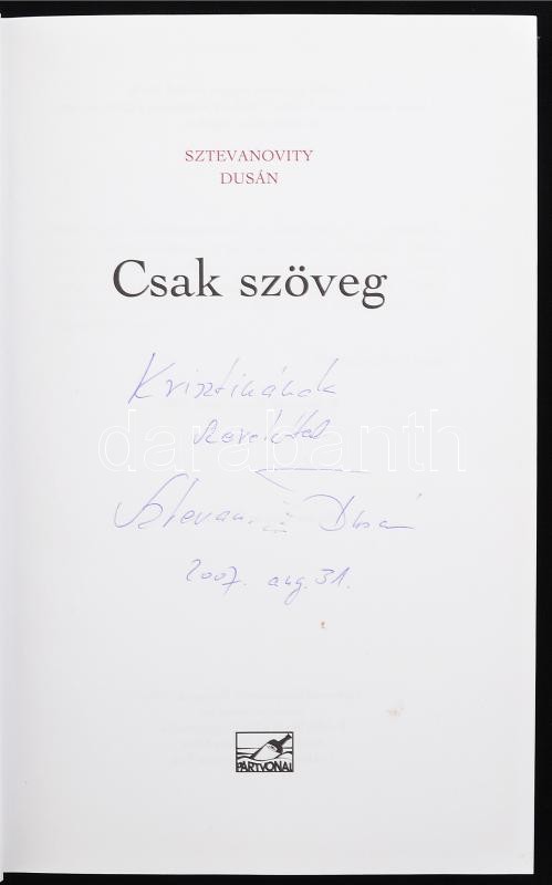 Leírás: Sztevanovity Dusán: Csak a szöveg. Bp., 2007, Partvonal. Kiadói keménykötésben. Dedikált példány!