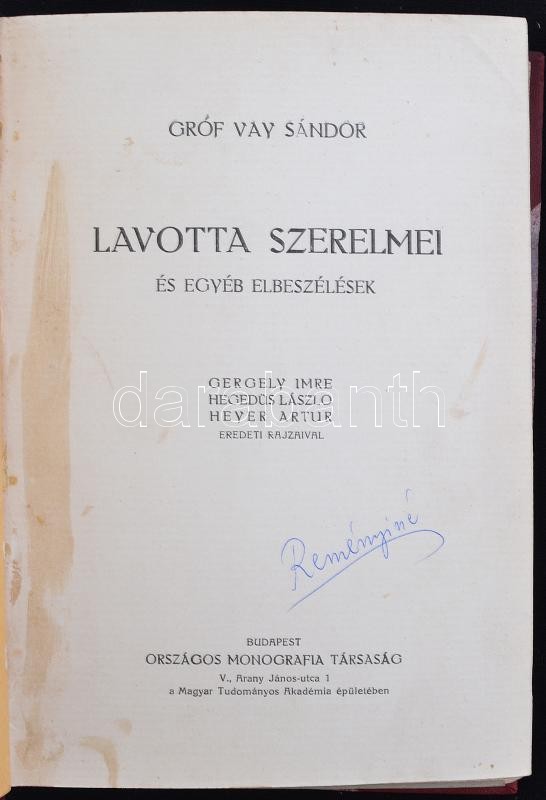 Leírás: gróf Vay Sándor: Lavotta szerelmei és egyéb elbeszélések. Bp., é.n., O.M.T. Légrády. 195 p. Korabeli félvászonkötésben.
