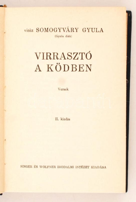 Leírás: vitéz Somogyváry Gyula: Virrasztó a ködben. Versek. Bp., é.n., Singer és Wolfner. Kiadói aranyozott egészvászon-kötésben, szép állapotban.