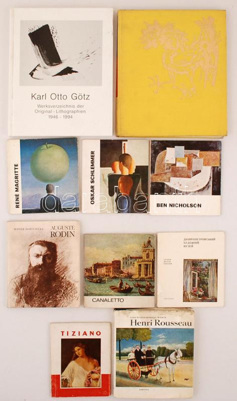 10 db művészeti album-Canaletto, Ben Nicholson, René Magritte, Oskar Schlemmer, Tiziano, Auguste Rodin, Henri Rousseau, stb. Kötetenként változó kötésben és állapotban, általában jó állapotban.