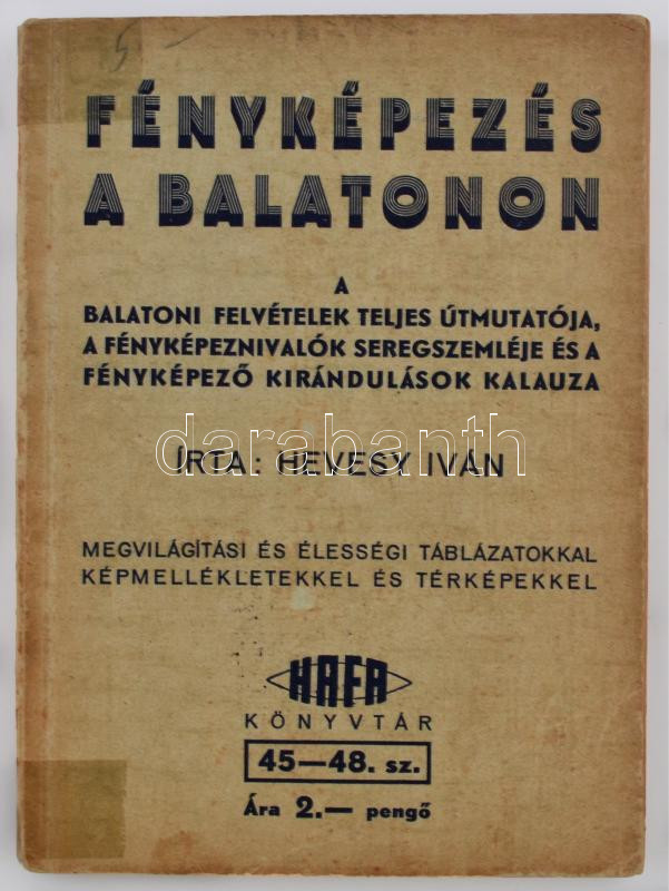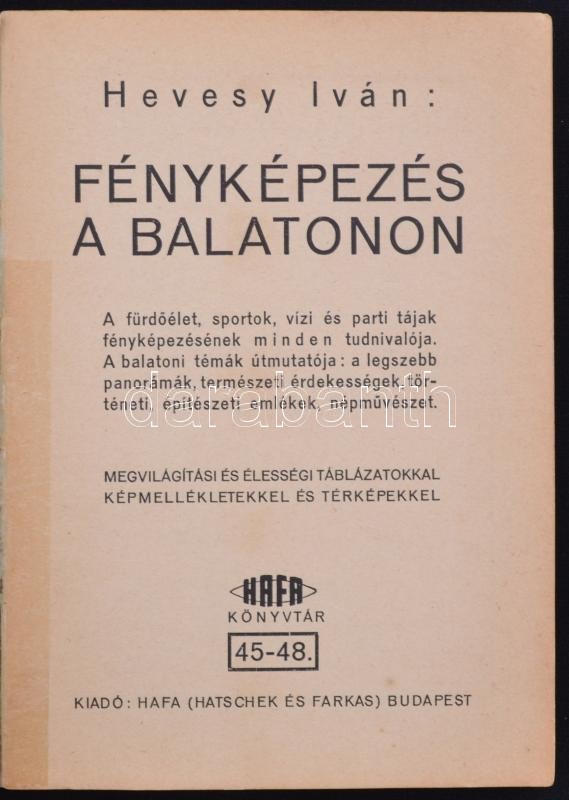 Hevesy Iván: Fényképezés a Balatonon. A balatoni felvételek teljes útmutatója, a fényképeznivalók seregszemléje és a fényképező kirándulások kalauza. Bp., HaFa. Kiadói papírkötés, celluxszal ragasztott, kopottas állapotban.