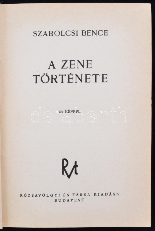 Szabolcsi Bence: A zene története. 84 képpel. Bp., 1940, Rózsavölgyi és Társa Kiadása. Kiadói egészvászon kötés, gerincnél kissé szakadt, kopottas állapotban.