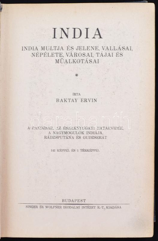 Baktay Ervin: India. India multja és jelene, vallásai népélete, városai tájai és műalkotásai. I-II. kötet, Bp., 1932. Singer és Wolfner összesen 282 db képpel és 1db térképpel, kiadói vászonkötésben.