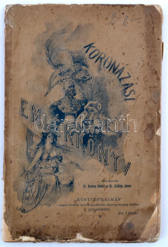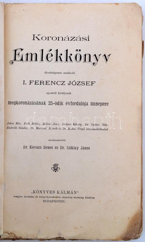 Koronázási emlékkönyv dicsőségesen uralkodó I. Ferencz József apostoli királyunk megkoronázásának 25-ödik évfordulója ünnepére. Kiadói papírkötésben! Jókai Mór, Falk Miksa, Rákosi Jenő, Vadnai Károly, Czobor Béla, Endrődi Sándor, Marczali Henrik és Koltai Virgil közreműködésével szerk. Dr. Kovács Dénes és Dr. Sziklay János. Bp., 1892, Könyves Kálmán Rt. 128 p. Egészoldalas képekkel illusztrálva. Kiadói, foltos, gerincén kissé javított papírkötésben. Kívül foltos, belül azonban jó állapotban.