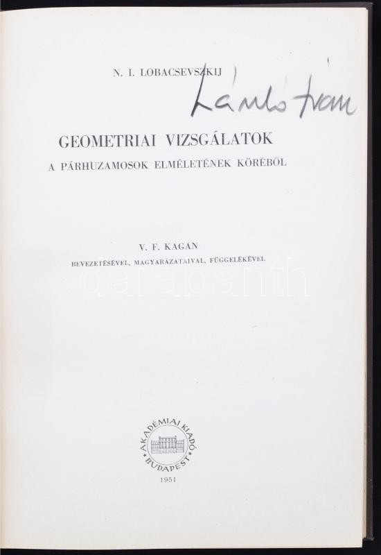 N. I. Lobacsevszkij: Geometriai vizsgálatok. a párhuzamosok elméleténe... https://www.darabanth.com/hu/255-Gyorsarveres/255.0/Festmeny-mutargy-papirregiseg-egyeb/Konyvek-Tudomany-es-technika~600037/N-I-Lobacsevszkij-Geometriai-vizsgalatok-a-parhuzamosok-elmeletenek-korebol-Bp-1951--A~II1250250