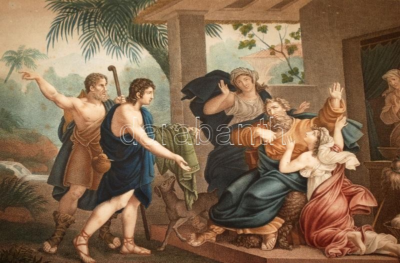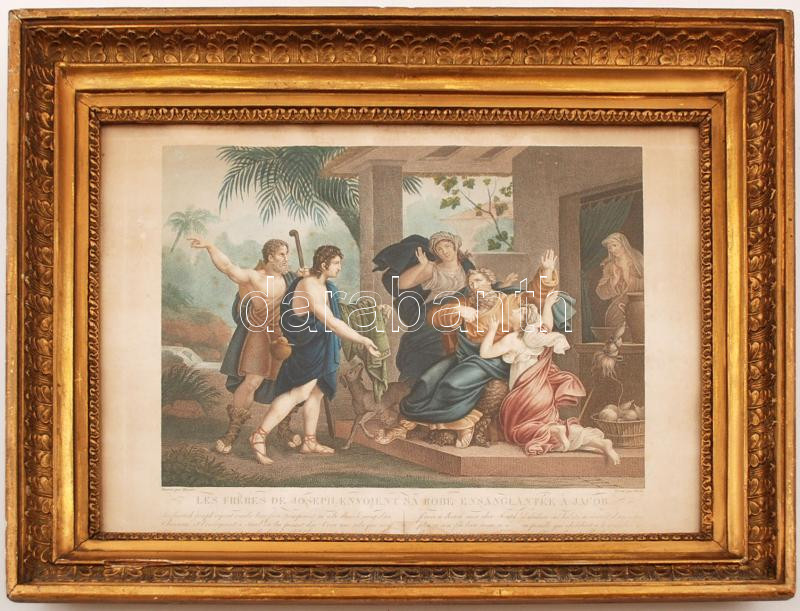 Leírás: cca 1850 József véres ruhái, francia metszet, színes litográfia, foltos, üvegezett keretben, jelzett, 24×36 cm