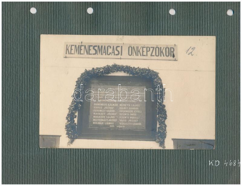 Leírás: 1925 Kemenesmagasi Önképzőkör elhunyt hőseinek emléktáblája, kartonra ragasztott, hátoldalon feliratozott fotó, 9x13 cm