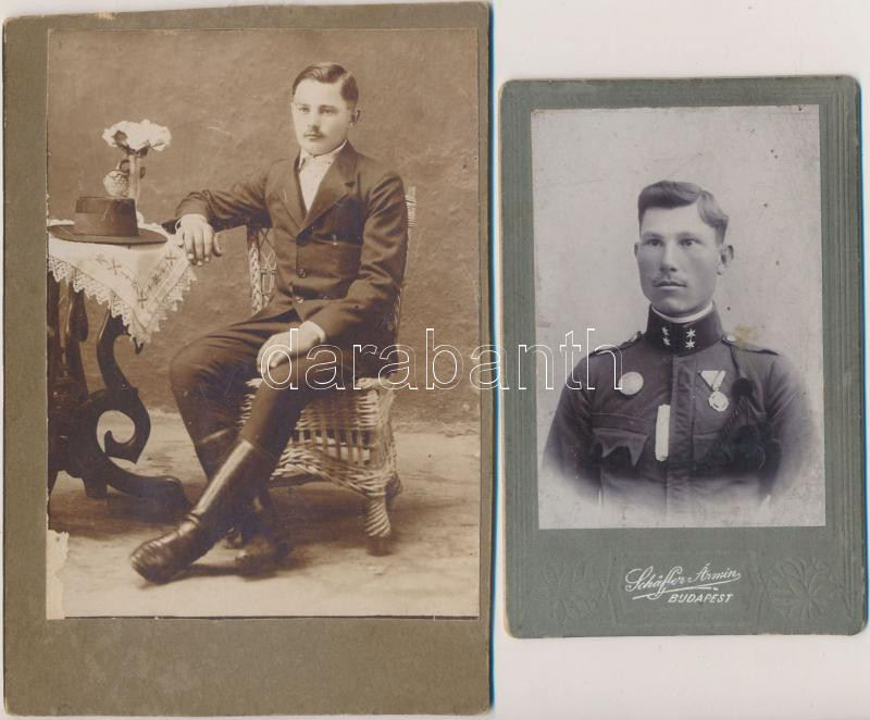 Leírás: cca 1900 2 db keményhátú fotó, az egyiken a fiatalember katonai egyenruhában, az egyik Schäffer fotó, 11x7 és 14x10 cm