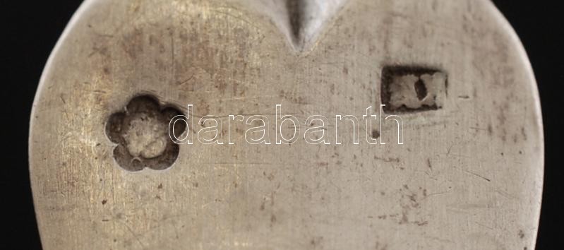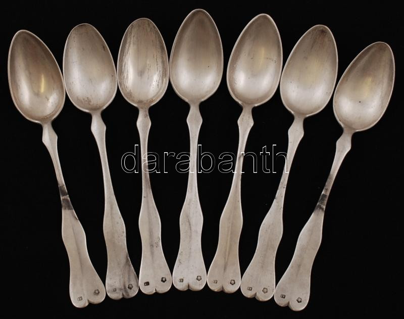 Leírás: Ezüst (Ag.) teáskanál (7 db.), jelzett, monogrammal, mesterjeggyel (K.M.), h:15 cm, nettó: 215 g