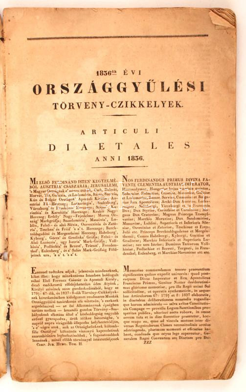 Leírás: 1836 dik évi országgyűlésen alkotott törvényczikkelyek. Latin és magyar nyelven. Pozsonyban, 1836. Nagyalakú, kissé rojtos papírkötésben.