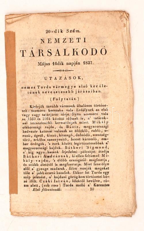 1837 A Nemzeti Társalkodó c. lap 20. száma. Utazás Torda vármegyébe https://www.darabanth.com/hu/255-Gyorsarveres/255.0/Festmeny-mutargy-papirregiseg-egyeb/Nyomtatvanyok~600029/1837-A-Nemzeti-Tarsalkodo-c-lap-20-szama-Utazas-Torda-varmegyebe~II1249334