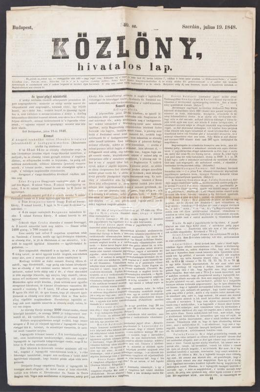 Leírás: 1848 A Közlöny c. újság július 19.-i száma a szabadságharc híreivel, szép állapotban,pp.:6, 49x31cm