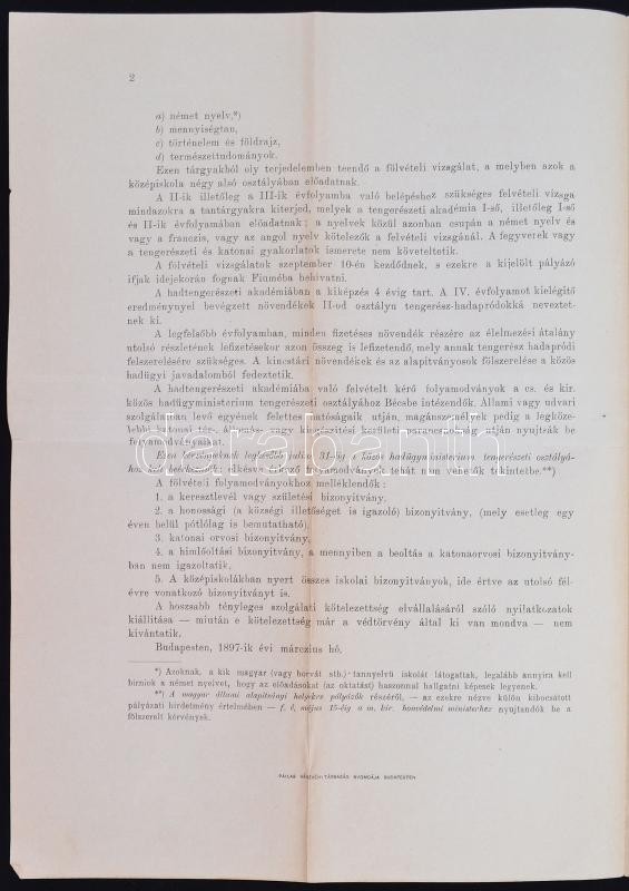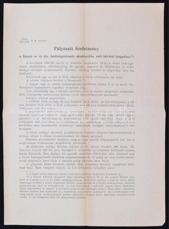 Leírás: 1897 Pályázati hirdetmény a fiumei cs. és kir. hadtengerészeti akadémiába való felvétel tárgyában 2p.