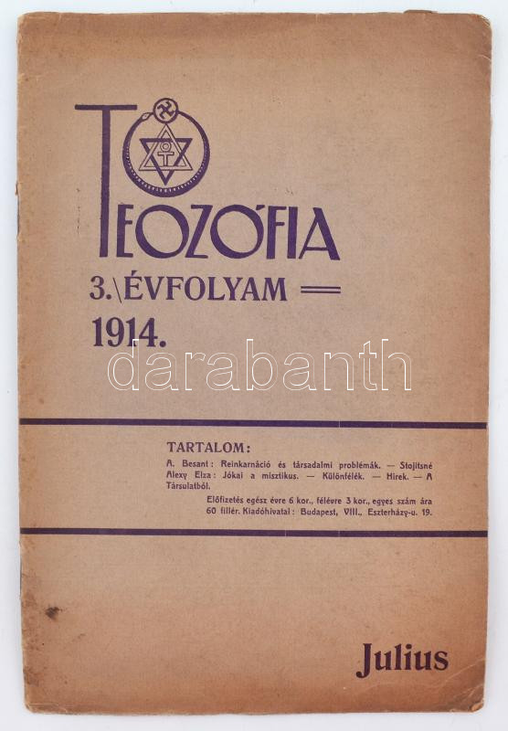 1914 Teozófia c. újság júliusi száma https://www.darabanth.com/hu/255-Gyorsarveres/255.0/Festmeny-mutargy-papirregiseg-egyeb/Nyomtatvanyok~600029/1914-Teozofia-c-ujsag-juliusi-szama~II1241382