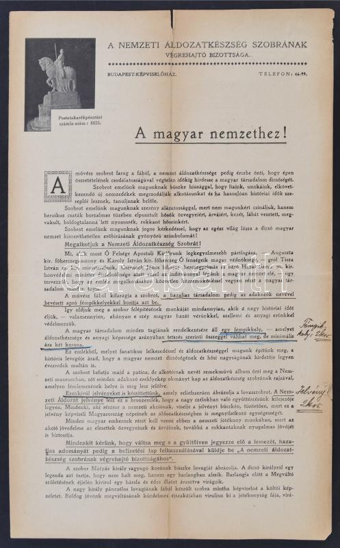 1915 A Nemzeti Áldozatkészség Szobrának Végrehajtó Bizottsága által a ... https://www.darabanth.com/hu/255-Gyorsarveres/255.0/Festmeny-mutargy-papirregiseg-egyeb/Nyomtatvanyok~600029/1915-A-Nemzeti-Aldozatkeszseg-Szobranak-Vegrehajto-Bizottsaga-altal-a-magyar-nemzethez-inte~II1250204
