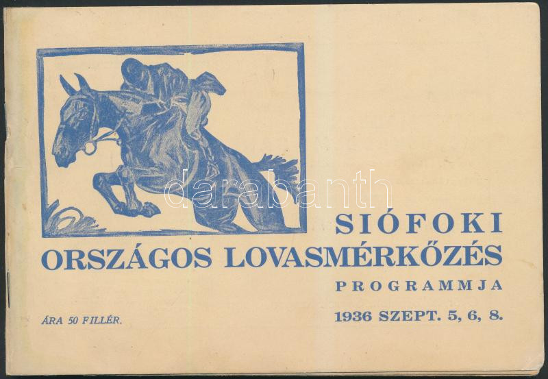 1936 A Siófoki Országos Lovasmérkőzés programja, pályaábrákkal, tollas... https://www.darabanth.com/hu/255-Gyorsarveres/255.0/Festmeny-mutargy-papirregiseg-egyeb/Nyomtatvanyok~600029/1936-A-Siofoki-Orszagos-Lovasmerkozes-programja-palyaabrakkal-tollas-bejegyzesekkel-22p~II1245235