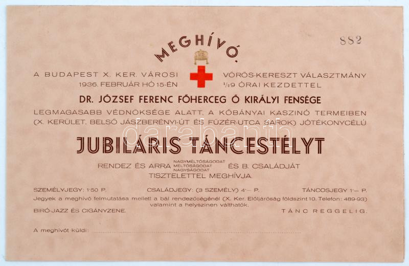 1936 Meghívó a Budapesti Vöröskereszt jubiláris táncestélyére. Sorszám... https://www.darabanth.com/hu/255-Gyorsarveres/255.0/Festmeny-mutargy-papirregiseg-egyeb/Nyomtatvanyok~600029/1936-Meghivo-a-Budapesti-Voroskereszt-jubilaris-tancestelyere-Sorszamozott-dombornyomott~II1245040