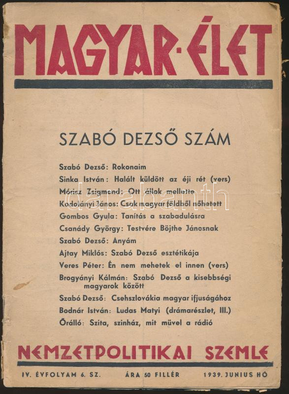 1939 A Magyar Élet(Nemzetpolitikai Szemle) IV. évfolyamának 6. száma, ... https://www.darabanth.com/hu/255-Gyorsarveres/255.0/Festmeny-mutargy-papirregiseg-egyeb/Nyomtatvanyok~600029/1939-A-Magyar-EletNemzetpolitikai-Szemle-IV-evfolyamanak-6-szama-Szabo-Dezso-irorol-sz~II1243047