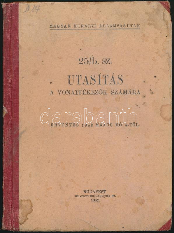 1942 Utasítás a vonatfékezők számára, 25/b. sz. Bp., 1942, Budapesti ... https://www.darabanth.com/hu/255-Gyorsarveres/255.0/Festmeny-mutargy-papirregiseg-egyeb/Nyomtatvanyok~600029/1942-Utasitas-a-vonatfekezok-szamara-25b-sz-Bp--1942-Budapesti-Hirlapnyomda-Kisse-vi~II1250289