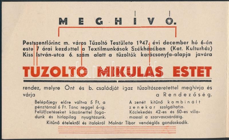 1947 Meghívó a pestszentlőrinci tűzoltó testület Mikulás-estjére, prog... https://www.darabanth.com/hu/255-Gyorsarveres/255.0/Festmeny-mutargy-papirregiseg-egyeb/Nyomtatvanyok~600029/1947-Meghivo-a-pestszentlorinci-tuzolto-testulet-Mikulas-estjere-programmal~II1248400