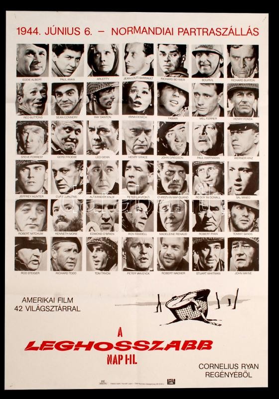 Leírás: 4 db nagyméretű filmplakát: Éjszakai rohanás, Metro-Goldwyn-Mayer jubileum, Es war einmal in Amerika, A leghosszabb nap I-II., hajtottak, klf méretben