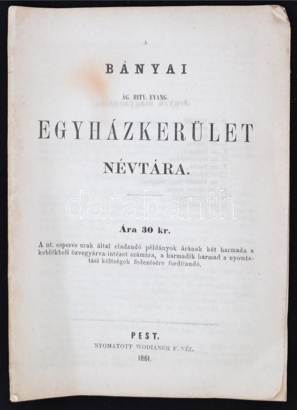 Leírás: A bányai ág. hitv. evang. egyházkerület névtára. Pest, 1861, Wodianer.