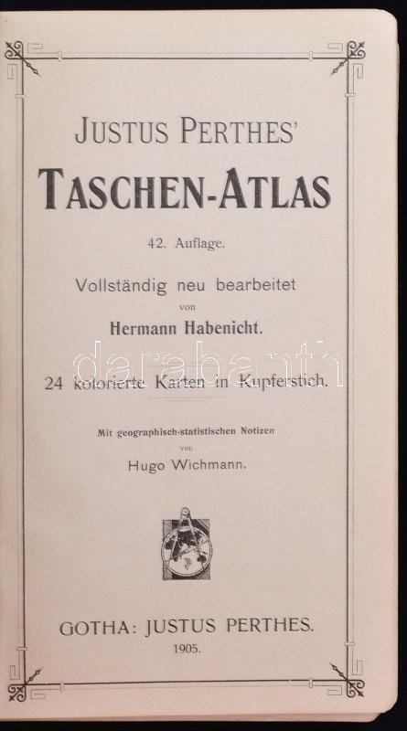 Leírás: Justus Perthes' Taschen-Atlas. Szerk.: Habenicht, Hermann. Gotha, 1905, Justus Perthes. 24 db rézmetszetes térkép nyomatával. Gazdagon díszített vászonkötésben, jó állapotban.