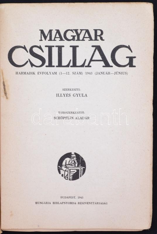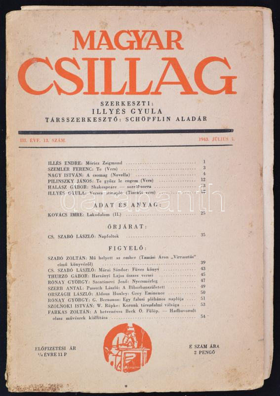 Magyar Csillag. Szerkeszti Illyés Gyula. III. évf. 13. szám. 1943. júl... https://www.darabanth.com/hu/255-Gyorsarveres/255.0/Festmeny-mutargy-papirregiseg-egyeb/Nyomtatvanyok~600029/Magyar-Csillag-Szerkeszti-Illyes-Gyula-III-evf-13-szam-1943-julius-1-56-p-Kiadoi-geri~II1241252
