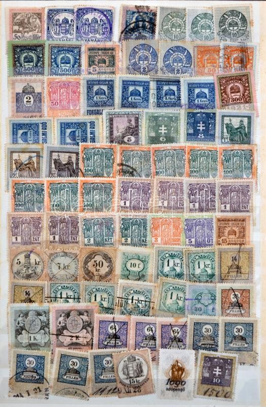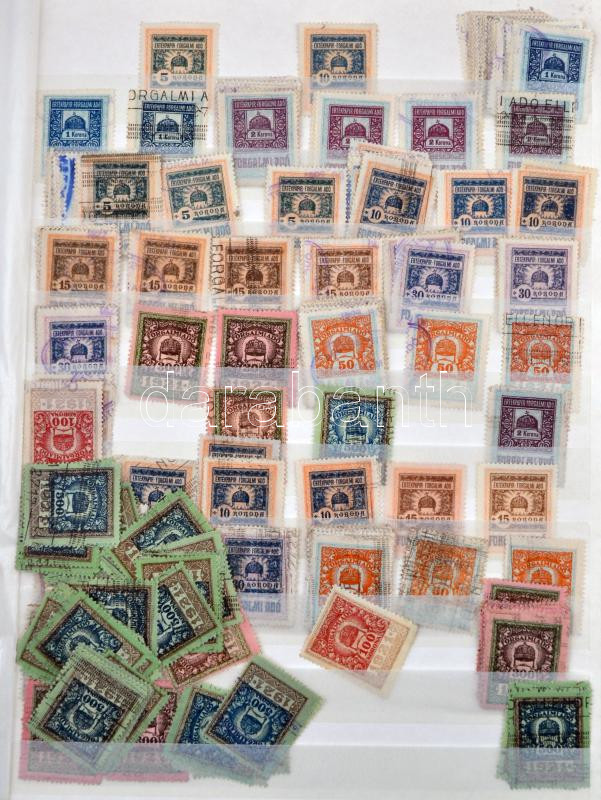 Leírás: 1000-es nagyságrendű okmánybélyeg készlet 4 db A4-es berakóban + magyar bélyegek és okmánybélyegek 10 lapos kis berakóban