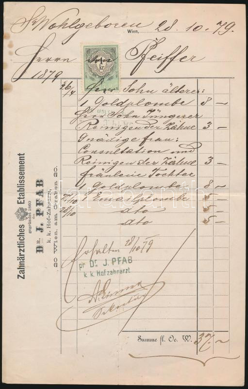 Leírás: Ausztria 1856 galíciai okmány 15kr C.M. okmánybélyeggel + 1879 Fogorvosi számla 4kr okmánybélyeggel