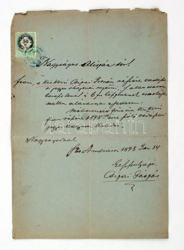 Leírás: 1878 Szentandrás, Alispánhoz intézett vadászati jegy kérvényező levél, 50 kr okmánybélyeggel