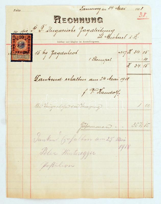 Leírás: 1918 Magyar vadászegyesület részére kiállított számla 15kg puskagolyóról