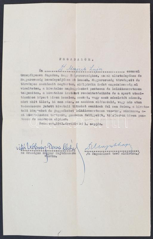 Leírás: 1941 Az Országos Magyar sajtókamara által kiállított, aláíratott hivatali eskü