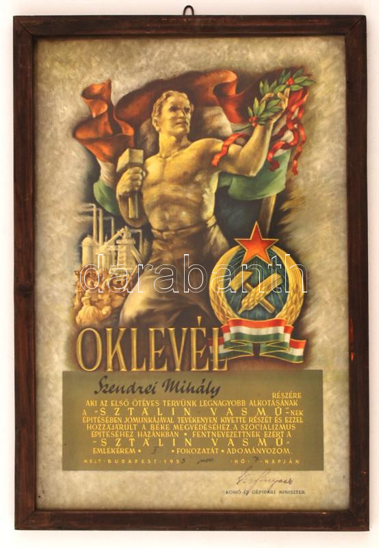 Leírás: 1953 Bp., Oklevél a Sztálin Vasmű építésénél elvégzett dicséretes munkáért kapott éremadományozásról, üvegezett leretben