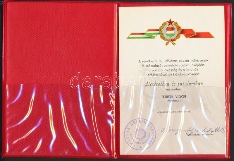 Leírás: 1984 Bp., Kiváló sajtómunkáért Török Vidornak adott honvédelmi miniszteri dicsérő oklevél