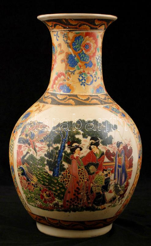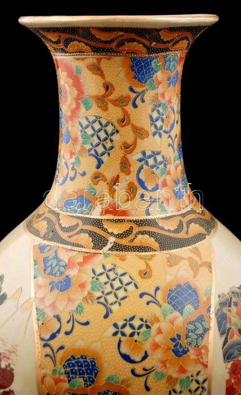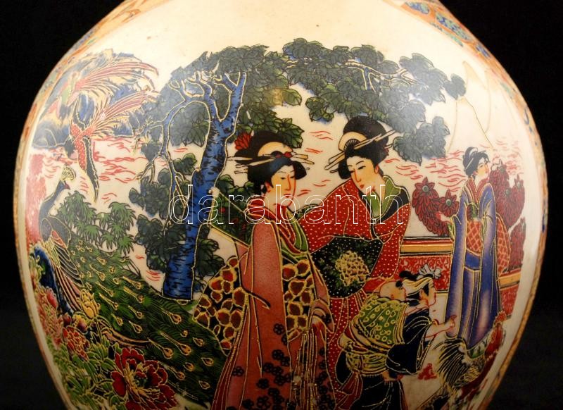 Leírás: Japán díszváza, életképes jelenettel, jelzés nélkül, részben kézzel festett, hibátlan, m:36 cm