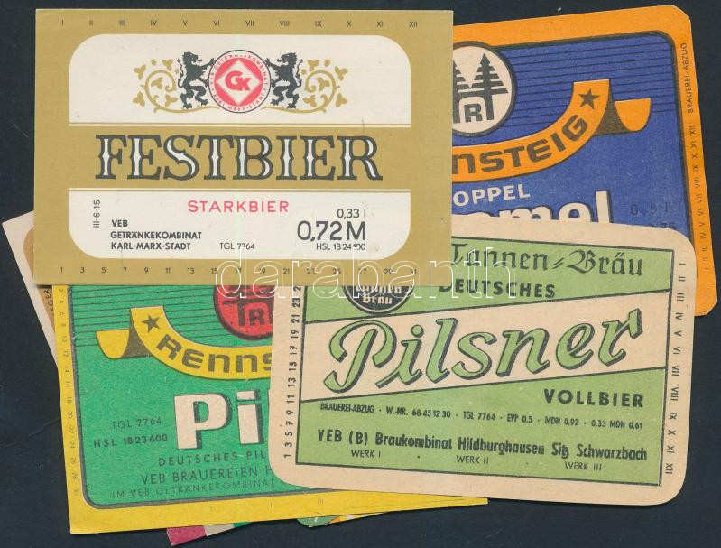 Leírás: 25 db sörcímke az NDK-ból(Tannen-Bräu Pilsner, Rennsteig Pils, Hartmannsdorfer Bock-Bier Hell, stb.)
