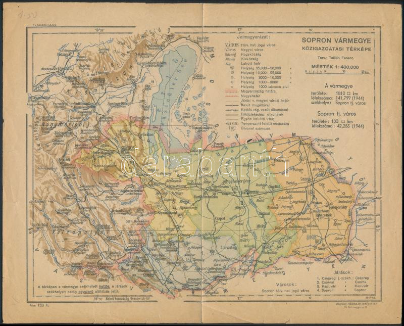 Leírás: 1947 Sopron vármegye közigazgatási térképe, terv. Tallián Ferenc, Magyar Földrajzi Intézet Rt. kiadása, kis szakadásokkal, 21x26 cm