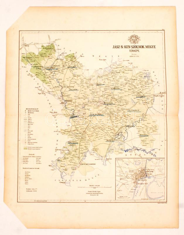Jász-N-Szolnok megye térképe, Gönczy Pál - Kogutowicz Manó: Magyarország megyéinek kézi atlasza. Tervezte: - -, rajzolta: - - Bp. (1890.) Posner Károly Lajos és fia. 2 sarok levágva, egyébként jó állapotban, 45x57cm