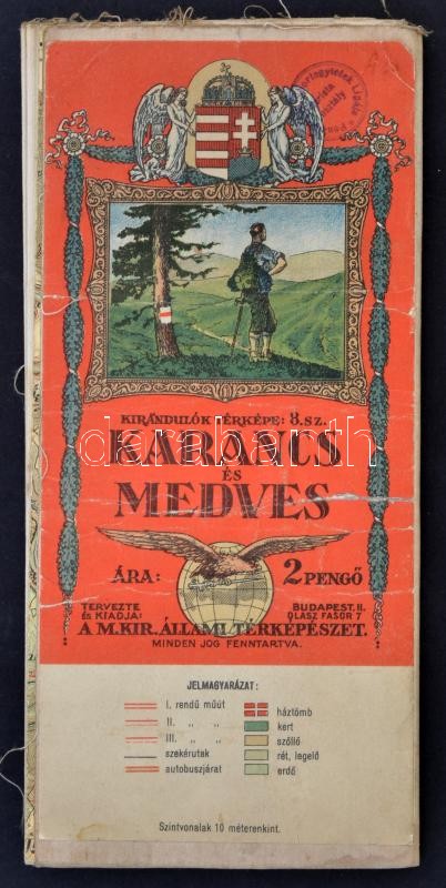 Leírás: cca 1930 Kirándulók térképe 8.: Karancs és Medves, 1:40000, M. Kir. Állami Térképészeti Intézet, vászonra ragasztva, 45,5×51,5 cm