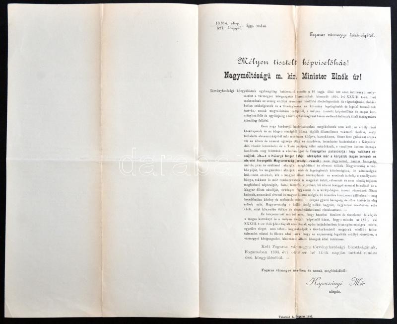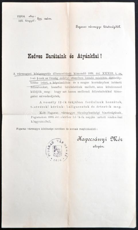 1893 A Fogaras vármegyei alispán által kiadott körlevél a vármegyei közigazgatás államosításával kapcsolatban, hozzá a m. kir. miniszterelnökhöz intézett levél szövegével