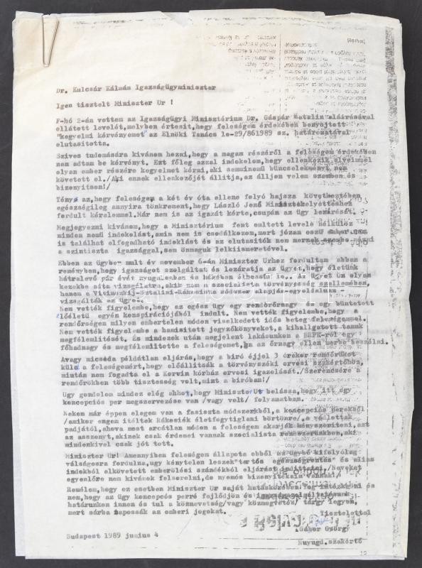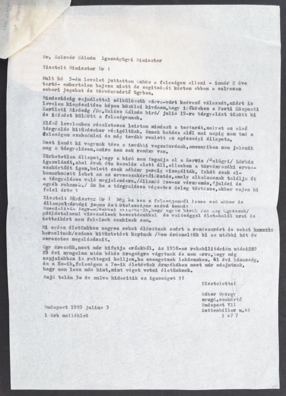 1989 Gábor György (1909-?) nyugdÃjas szakértÅ‘ 2 db levelének géppel Ãrt piszkozata Kulcsár Kálmán (1928-2010) jogász, igazságügy-miniszter részére a rendÅ‘rség és a bÃróság részérÅ‘l Å‘t magát és feleségét érÅ‘ atrocitások tárgyában